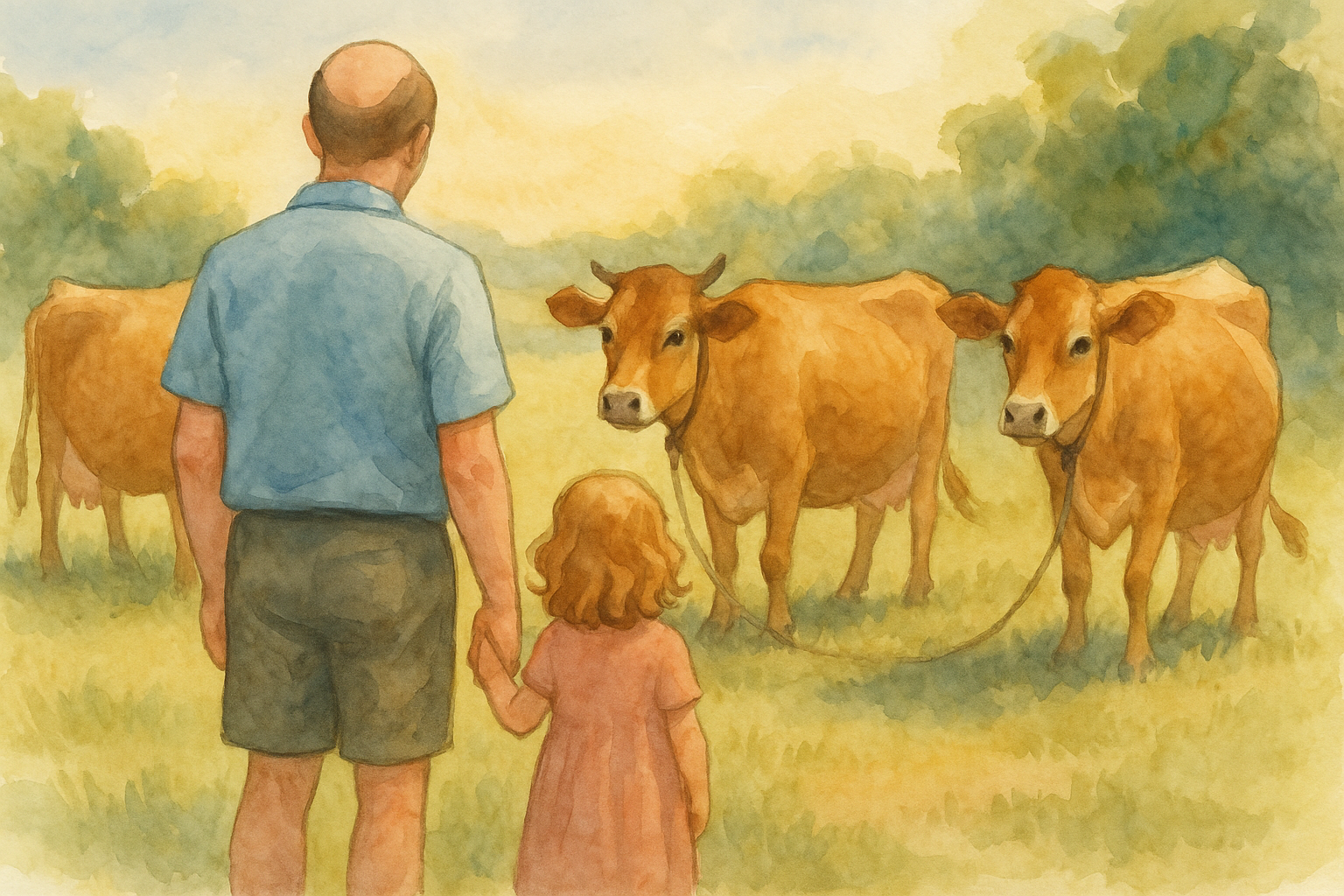 I was lucky enough to grow up in a house surrounded by open fields in the countryside. One of these fields was home to a herd of cows, each one tethered individually, something you luckily don’t see much of now, but it did grant us the opportunity to safely go in the field with them. Most evenings, my dad would take me out to say goodnight to them. We’d walk from cow to cow, I’d wave and say goodnight. It may not have been as often as I like to think, but I remember it clearly enough that it had an impact on me.